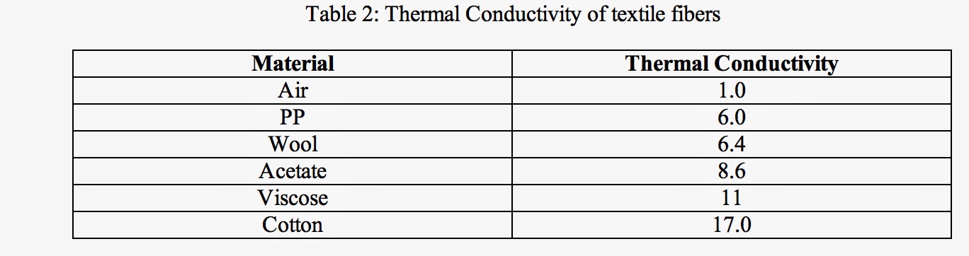Polypropylene fibers have a softening point in the region of 150°C and a melting point at 160-170°C. At temperatures of -70°C or lower, polypropylene fibers retain their excellent flexibility. At higher temperature (but below 120°C) polypropylene fibers nearly retain their normal mechanical properties. Polypropylene fibers have the lowest thermal conductivity of all commercial fibers. In this respect, it is the warmest fiber of all. The thermal conductivity of common textile fibers is shown in the Table below.